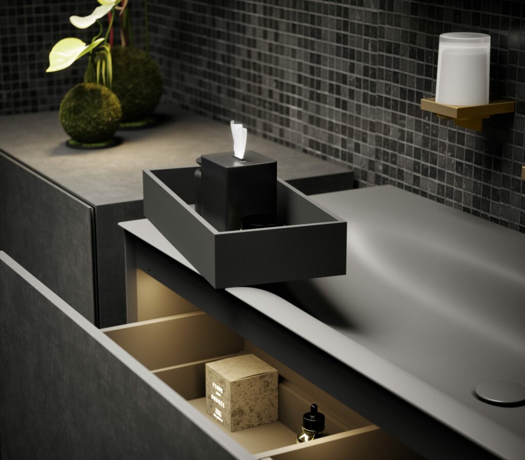 Der Innenraum der Schubläden der EDITION 11 ART ist stets in edlem Carbon-Schwarz gehalten, was eine beeindruckende Harmonie schafft. Die carbon-schwarzen Aufbewahrungsboxen fügen sich nahtlos ein, während Varianten in Furnierausführung den Look des Korpusfurniers aufgreifen. Die längs platzierten Boxen strukturieren den unteren Bereich, während quer angeordnete Boxen zusätzlichen Stauraum auf einer zweiten Ebene eröffnen. Diese Aufbewahrungslösungen sind sowohl für Waschtischunterbauten als auch für die Sideboards der Serie perfekt geeignet.